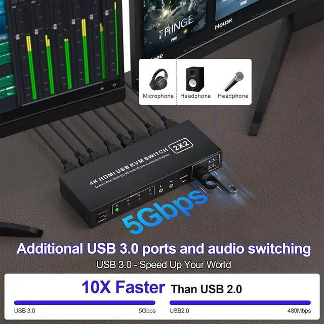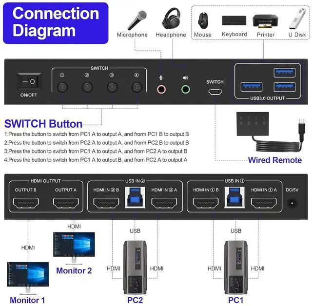 You can easily have a dual monitor setup per system or a single monitor showing both systems (one on each monitor)Dual monitors output support up to 4K@60Hz for extended,mirrored or spliced displayDepends on your computer's graphics cardWith EDID emulators in the extended display mode, keep PCs always have correct information, prevent displays setting change while switching inputs2 Switching modes: Button switch and wired remote.With extra 3* USB3.0 and Audio Microphone output