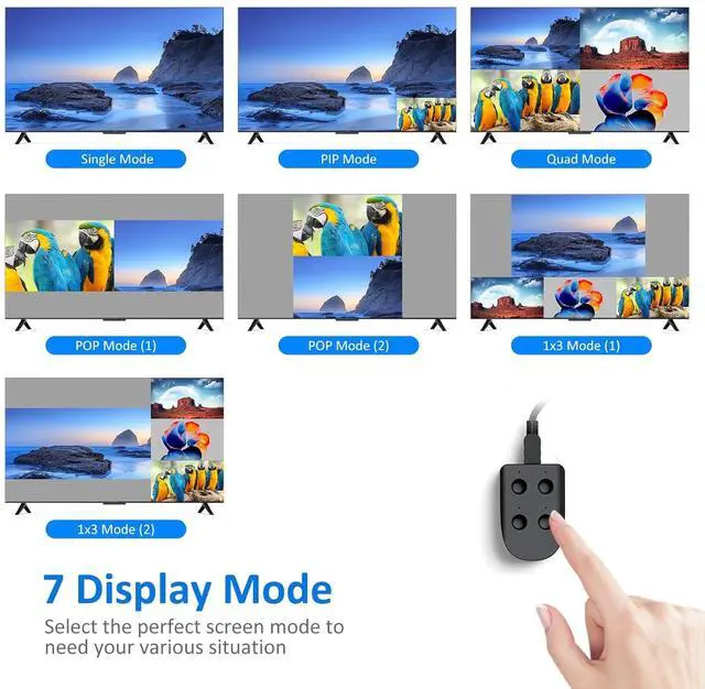 Mode 1: single screenMode 2: picture in picture (PiP)Mode 3: 2X2Mode 4: horizontal POPMode 5: vertical POPMode 6: vertical 1x3Mode 7: horizontal 1x3