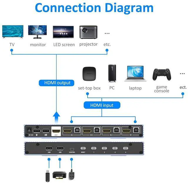 Supports the highest resolution 4K@30Hz Seamless switching, quick response, smooth screen without black or flashing screen Supports 4 switching methods: panel buttons, desktop controllers, auto scan and keyboard hotkeys Supports automatic scanning and can set the scanning time range to "5-999" seconds Supports independent gain adjustment for each port, with different modes enjoying independent gain parameters Supports 7 screen display modes: Compatible with quad multiviewer function, capable of multiple inputs and the same output, displaying multiple input sources on a single screen