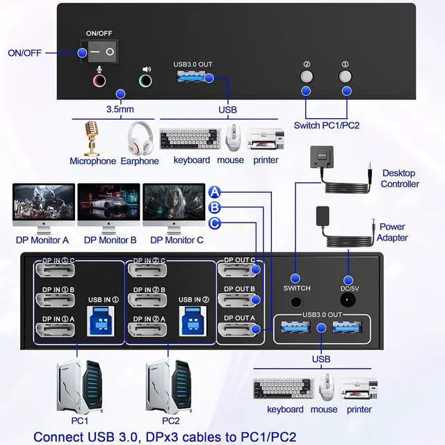 1. Insert the DC/5V adapter into the KVM ;2. Plug the 3*DisplayPort cable into the KVM switch and monitor;(Output)3. Plug the DisplayPort cable and USB cable into the KVM switch and your computer/laptop (DP cables are not included)(Input)DP IN 1A +DP IN 1B + DP IN 1C + USB IN 1=PC1DP IN 2A + DP IN 2B + DP IN 2C + USB IN 2=PC2Please check whether DP IN 1A, DP IN 1B, DP IN 1C, and USB IN 1 corresponding, and whether DP IN 2A, DP IN 2B, DP IN 2C and USB IN 2 are corresponding. Mixed insertion is not supported.4. Insert the mouse and keyboard into the KVM switch5. If needed, you can connect a microphone and audio port