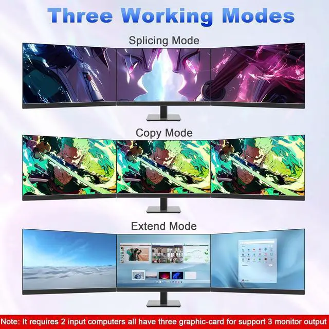 In Duplicate mode, 3 output monitors will output same image from PC1 or PC2 or PC3. Computer host outputs 3 identical images on 3 monitors. In EXTEND mode, the working window from main screen can be dragged to seond and third output monitor. You can have the mouse across between 3 monitors. PC host in output 3 different images on 3 monitorsIn Splicing mode, Computer host outputs splice screens on 3 monitors
