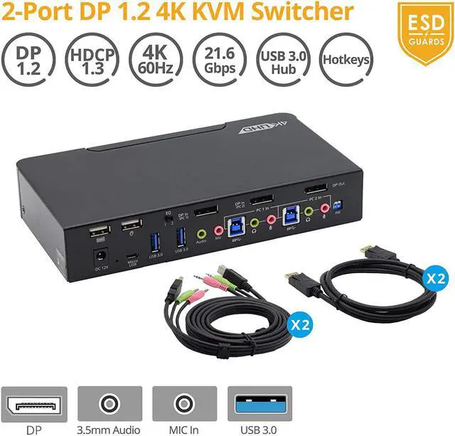 2-Port USB 4K DisplayPort KVM SwitchPower Adapter (12V/2A)2x DisplayPort Cables2x USB 3.0 + Mic + Stereo Cable SetsUser's Manual What We Do? What We Strive For? Founded By HDMI Extender HDMI Extender Splitter HDMI Splitter HDMI KVM Extender Matrix and Videowall Others gofanco Prophecy 2 Computer USB KVM Switcher For DisplayPort Enabled Equipment Built-in 4-port USB 3.0 Hub Specifications Simple Installation and Operation Switch Between 2 UHD 4K DisplayPort Computer Systems Applications Seamless Switching with HotKey Functionality What's in the Package