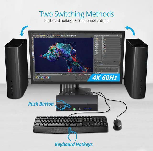 Switch between PCs with buttons or Hotkeys. Use Hotkeys to set up auto-scan for system monitoring.