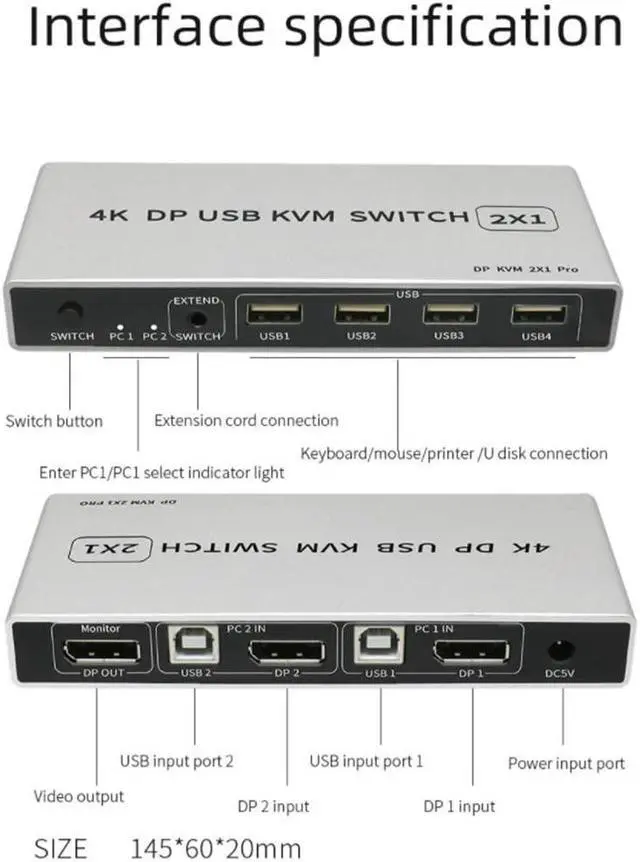 Description: Dual Port: One displayport video console controls two usb computers. Features: Strong stability, low power consumption, stable transmission. Strong compatibility: fully compatible with displayPort 1.2. High resolution: Superior video quality, 4K60hz. Ease of use: Computer selection via remote port selector, hotkeys, and toggle button. Specifications: Product Name: DP KVM 2 in 1 out Switch Color: silver gray Material: Aluminum Alloy Plug: US, UK, EU Connector type: DisplayPort DP version: DP1.2 Support system: all DP output devices Resolution: 4K60hz TMDS broadband: up to 300MHz per group Transmission speed: 5.4 Gbps Maximum supported resolution: 3840*2160 @60Hz Power supply: DC 5V Impedance: 100 ohms Maximum power consumption: 2W Cable length: about 2m Size: about 146x61.5x20mm (L * W * H) Package includes: 1pc * KVM switch 1pc * power adapter 1pc * English manual 2pcs * USB cable