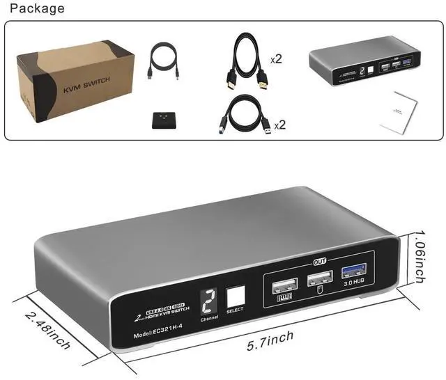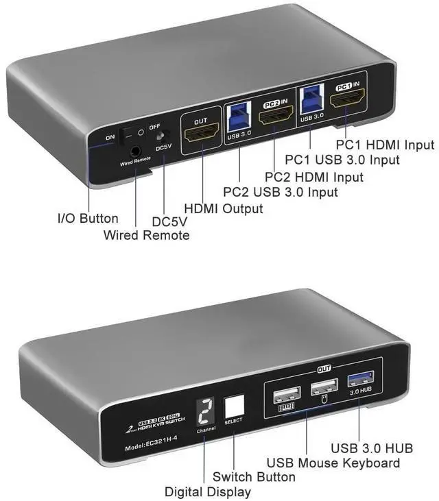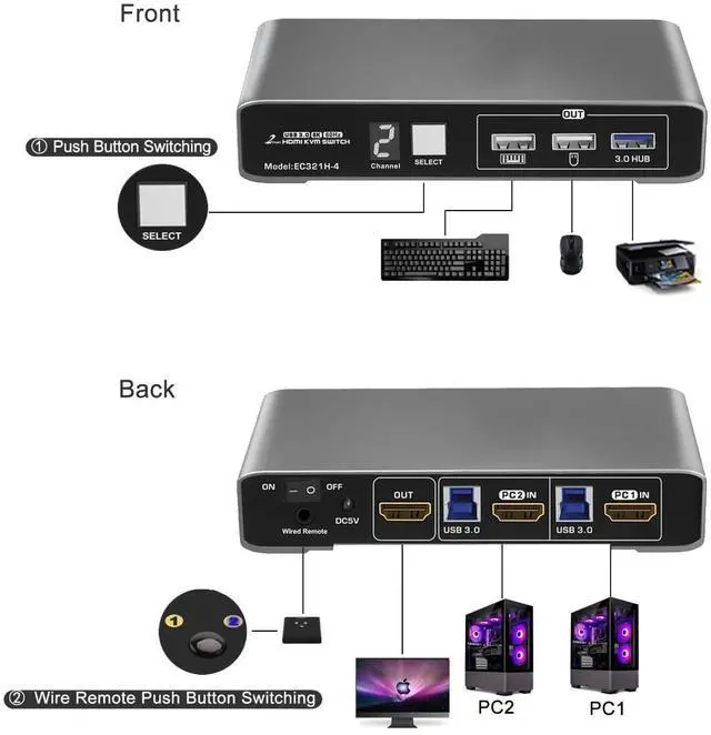 4K@60Hz DP1.2 KVM Switch: Experience crisp, detailed visuals with support for up to 4K@60Hz resolution, compatible with lower resolutions.