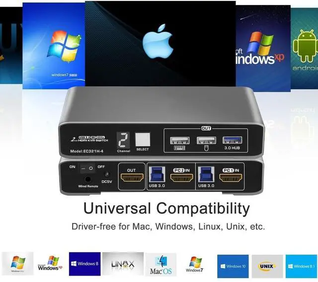 Broadly Compatible 2 In 2 Out DP KVM: Compatible with various operating systems, including Windows 10/7/2000/XP/Vista, Linux, UNIX, Ubuntu, Fedora, etc. Features Adaptive EDID for recognizing diverse display devices.