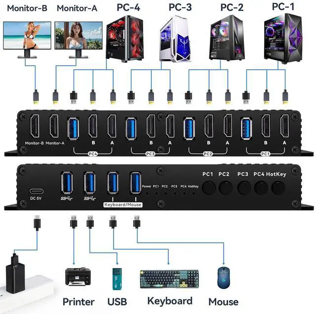 display port kvm Switch 2 Monitors 2 Computers 4k 144hz :the dp kvm switch support hotkey switching , you can use hotkey to switch between 2 computers,Right Control two times and number 1 and EnterRight Ctrl+Right ctrl+1+Enteryou will switch to PC-A, and Right Ctrl+Right ctrl+2+Enter you will switch to PC-B. You can use Keyboard Hotkey Right Ctrl+Right ctrl+B+Enter to turn off or turn on the Beep for the dual monitor kvm switch.