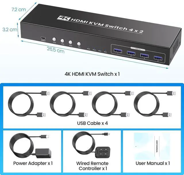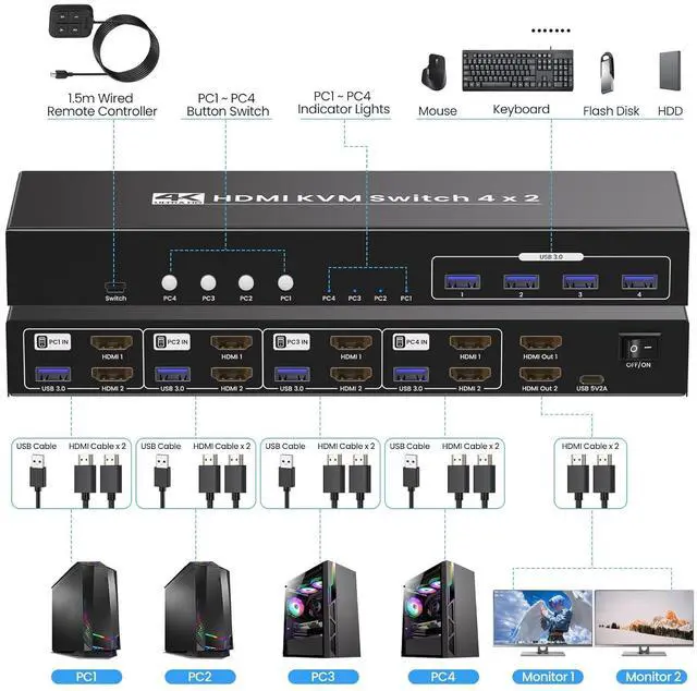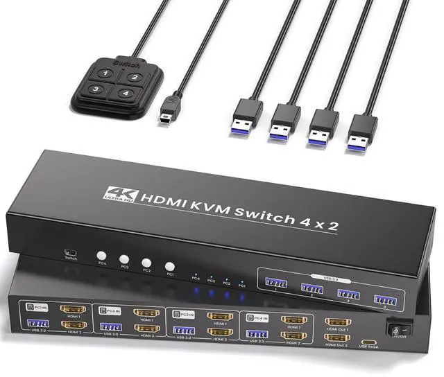 Control 4 computers with 1 set of keyboard, mouse and 2 monitorsUSB 3.0 integrationSupports up to 4K resolutions(3840x2160@60Hz)Two switching methodsSupports copy mode and extended mode 4 Port HDMI KVM Switch 2 Monitors 4 Computers - Seamless USB 3.0 Connectivity, Ultra HD 4K Display Master Multitasking with the 4K 4-Port HDMI KVM Switch: Effortlessly Connect 1 Monitor to 4 Computers Two Switching Methods - Button Switching & External Controller Switching Ultra-High Definition 4K Support USB 3.0 Hub Integration Enables Fast Data Transfer and Effortless Connectivity Package List Specifications & Features