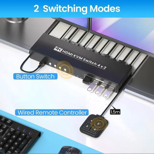This HDMI KVM switch 2 monitors 4 computers enables you to effortlessly manage and access content from four separate computers using only one monitor, keyboard, and mouse, streamlining your workspace and boosting productivity.