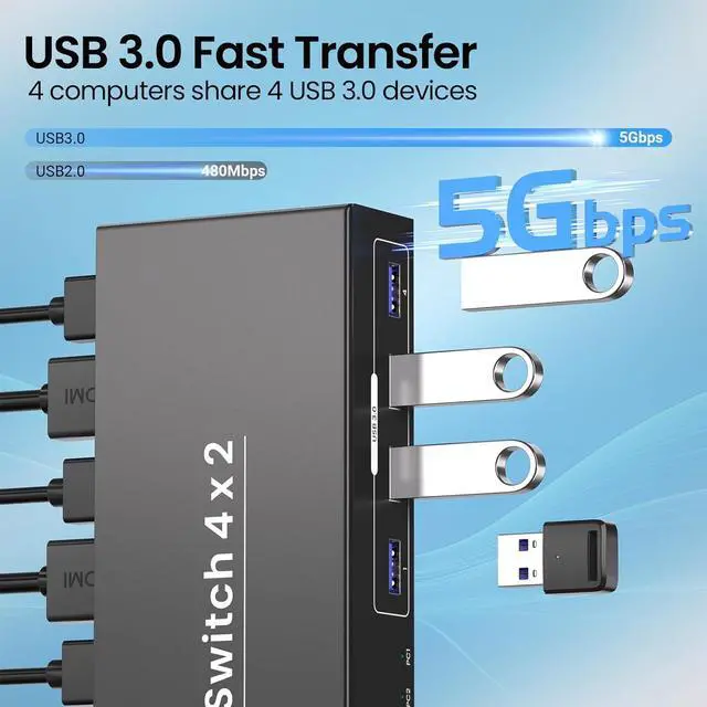 Integrate peripheral devices with the built-in USB 3.0 hub, enabling fast data transfer and effortless connectivity with keyboard, mouse, printer and other compatible hardware across all four computers.