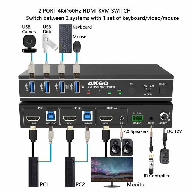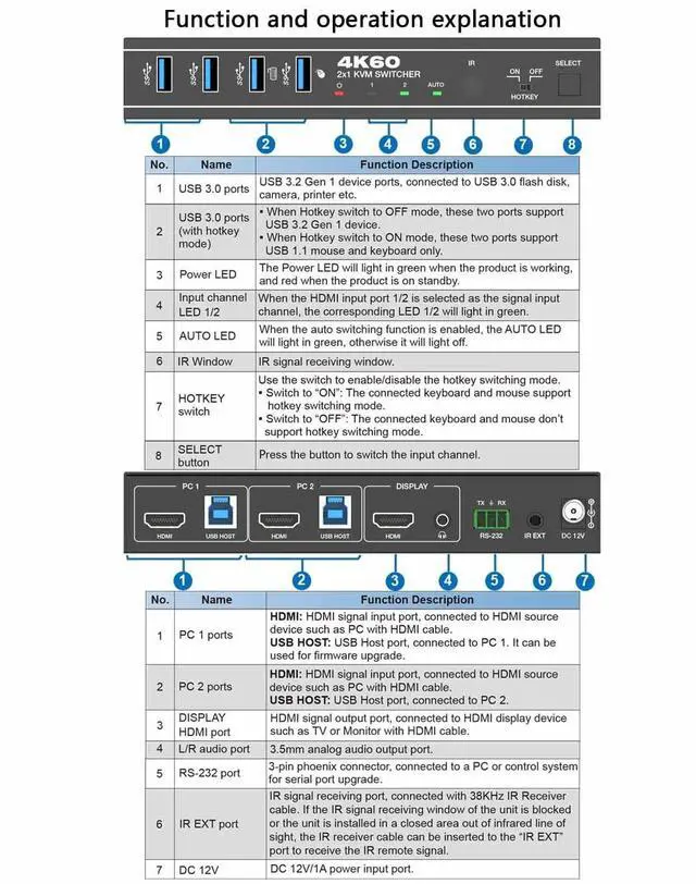 This BUNGPUNG 2x1 HDMI KVM Switcher with hotkey switching. It supports resolutions up to 4K@60Hz 4:4:4 8bit and can also transmit USB 3.0 signal up to 5Gbps for KVM function. The switcher features virtual interaction function, so that it can automatically wake up the connected PC that is in standby mode, which can reduce the switching time. It also supports direct switching through buttons on the front panel, IR remote, and hotkey through keyboard/mouse connected to the special USB port. It provides a wide compatibility choice for different operating systems, such as Windows, Mac OS and Linux, no driver required and simple plug and play.