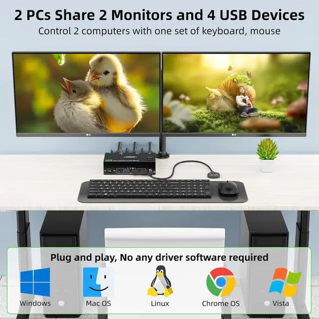 A set of keyboard mouse controls two computers, sharing two monitors, suitable for users with 2 computers and 2 monitors, supporting Mirror mode and extended Mode, helping you balance work and play.