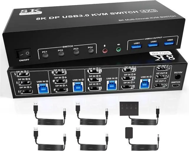 1x 4Ports USB 3.0 DisplayPort Triple Monitor KVM Switch,