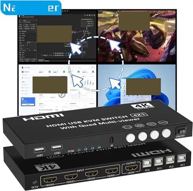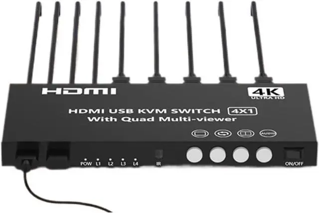 Ennovor 4K HDMI KVM Switch 4x1 Quad Multi Viewer 4 in 1 Out KVM HDMI Screen Multiviewer Seamless for 4 PC Share Mouse Keyboard(EU Power Plug)