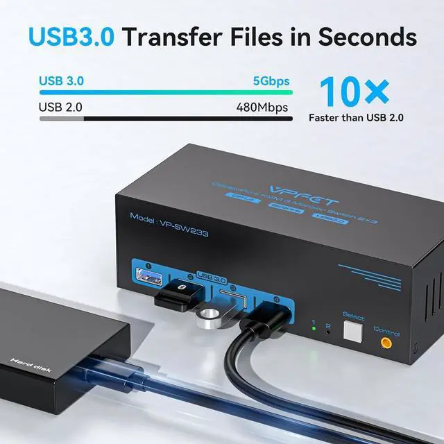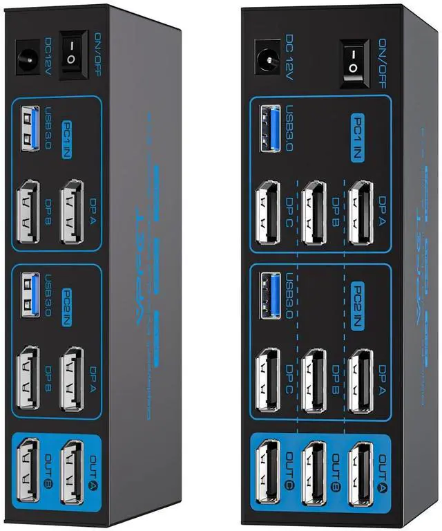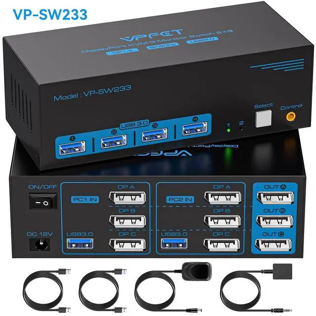 Displayport Dual Monitor Triple monitors KVM Switcher1:SW223:dp kvm switcher allows two computers or laptops to share two monitors; 2.SW233:allows 2 computers to share three monitors. Note: SW223 Both computers need to have 2 DP output ports and both monitors need to have DP connectors in order to use the switcher.SW233 Ensure that the computers have 3 DP ports and support multiple monitors.It is recommended that all cables are no longer than 1.5 meters in length.