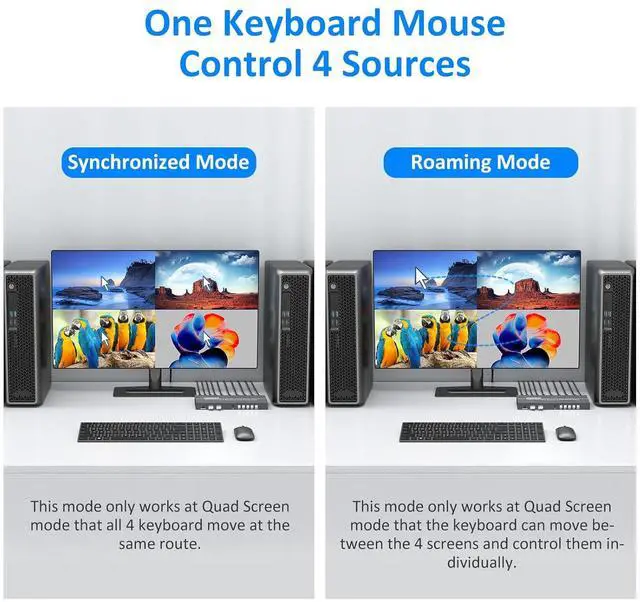 Works as 4x1 MultiviewerThis Quad KVM Switcher can allow 1 monitor displaying 4 sources simutaneously or individually, with 6 Display Modes:Single mode, 1x3 mode, PIP mode, POP mode(1), POP mode(2) and Quad mode