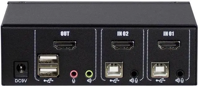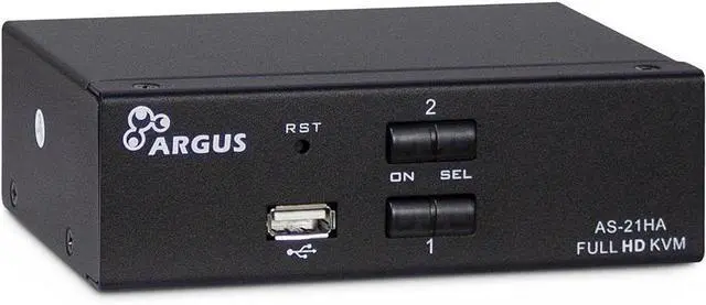 The KVM AS-21DA DVI is an affordable 2-port KVM switch with automatic audio switch for desktop areas. The KVM is connected to the computer via USB (keyboard/mouse), 2x 3.5 mm jack (audio mic/line) and DVI-I or DVI-D via the 2 supplied connection cables.