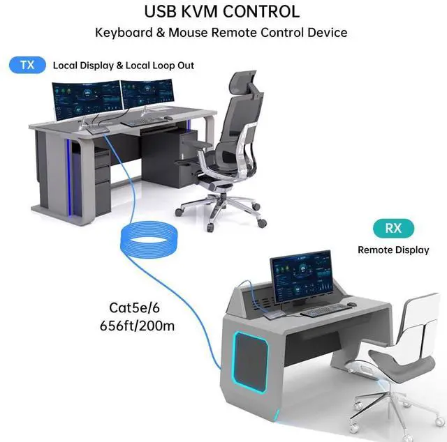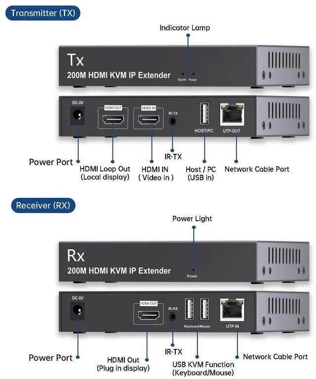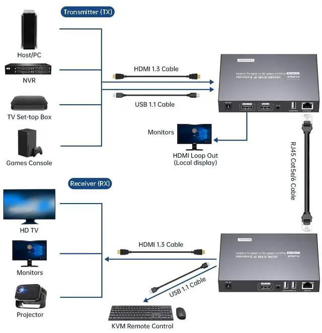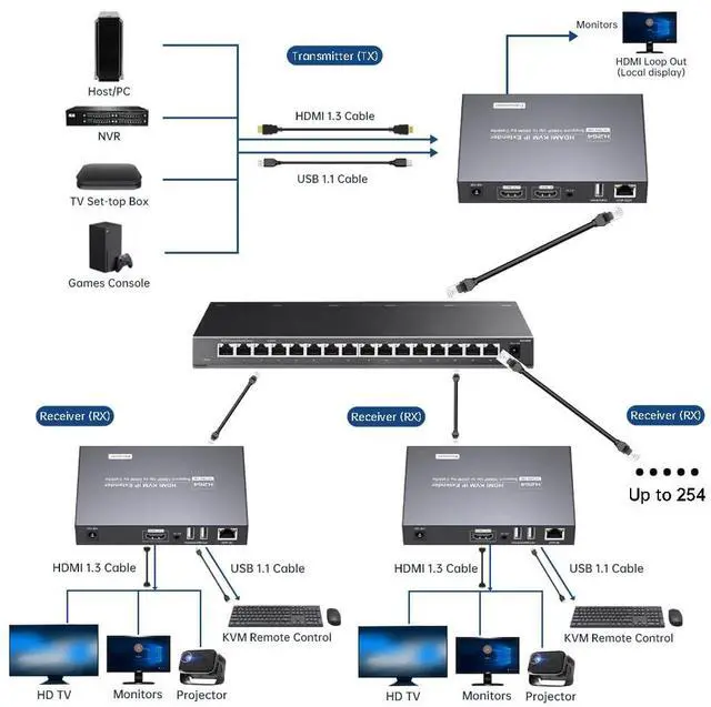 This HDMI KVM USB IP Extender supports two usage methods. 1. In most cases, it is used in a single-cable one-to-one mode, transmitting HDMI and USB signals over the cable to facilitate remote control of a mouse and keyboard. 2. It also supports a one-to-many cascading transmission mode (up to 254 cascades). The one-to-many cascading mode requires the use of an Ethernet switch and complies with the 802.3 Ethernet standard, supporting one transmitter (TX) to twenty receivers (RX). It is typically used when multiple monitors need to synchronously display images from the transmitter (TX). Receivers (RX) must be purchased separately for cascading mode. When cascading a large number of devices, a Gigabit Ethernet switch is recommended.