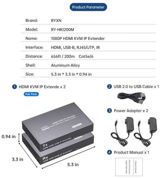 Accessories: 2×HDMI KVM Extender + 2×5V/1A Power Adapter + 1×USB Cable + 1×Product manual