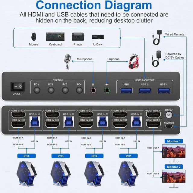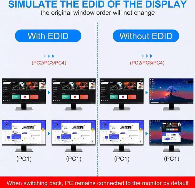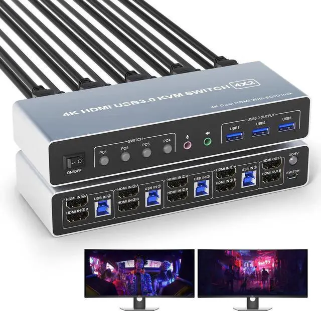 4 Port HDMI KVM Switch: This 4 port dual monitor KVM allows you to use a set of keyboard and mouse to control 4 computers, share 3 USB devices and 2 monitors. 4 ports does not mean that it can only be connected to 4 computers. You may have 4 computers currently, or you may only have 2 computers now, but you may need to use 3 or 4 computers in the future, then you can choose this switch. As long as your computer confirms that it supports dual-screen display, you can use 2 screens