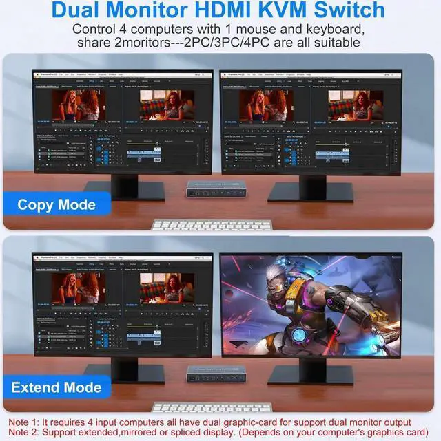 Support Ultra HD 4K Resolution: Our KVM supporting high resolution max up to 4K@60Hz. Note: Only when both your computer Graphics card and monitor support 4K@60Hz then you can get 4K@60Hz effect, so if you want the max resolution you have to check your devices first. And support copy mode and extension mode (requires your computer to have 2 HDMI port) copy mode: two monitors output the same picture, extender mode: two monitors output different pictures