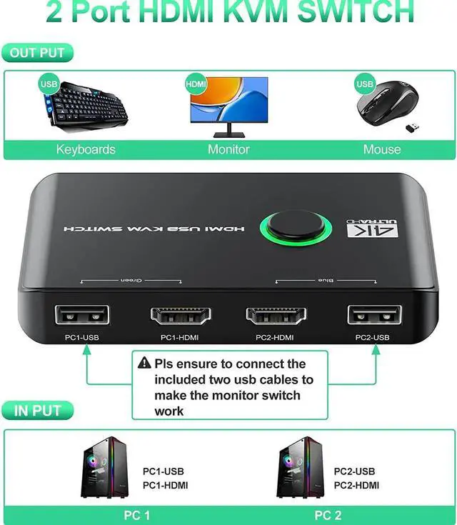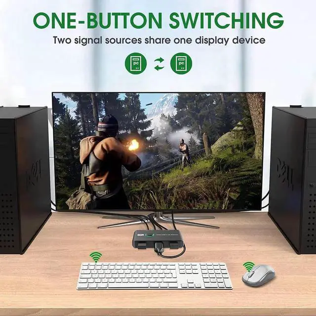 USB KVM Switch HDMI BoxThis KVM Switcher help you use one set of keyboard, mouse, keyboard and printer to control 2 computers. You can easily switch between two displays. KVM switches keep your work space tidy and make your life simpler and more efficient.