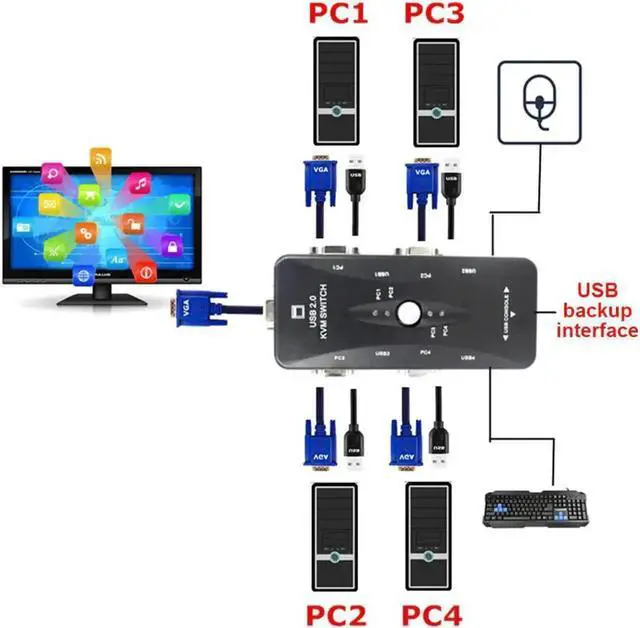 USB KVM Switch USB 2.0 Switcher for Keyboard Mouse Printer Monitor 2 PCs Sharing 4 Devices USB Switch