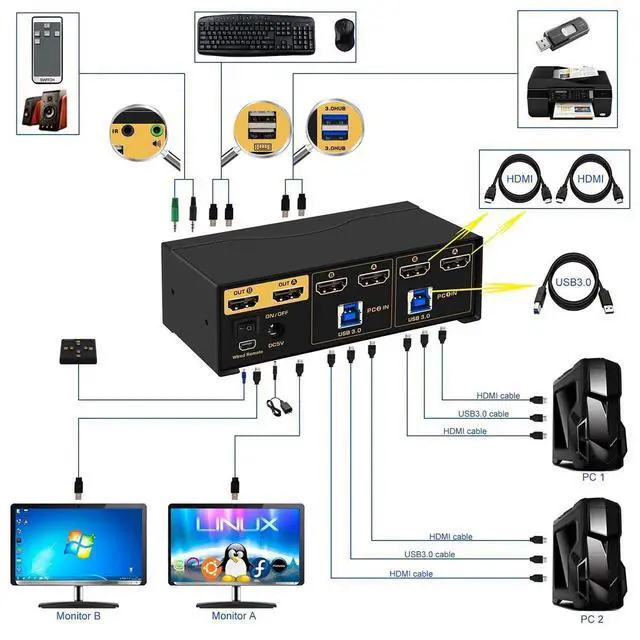 2 PORT KVM SWITCH DUAL MONITOR: Hook up 2 computers or laptops to share one independent set of keyboard, mouse, dual monitors and more USB 3.0 peripherals, a premium choice for reducing equipment and work safe from home efficiently;