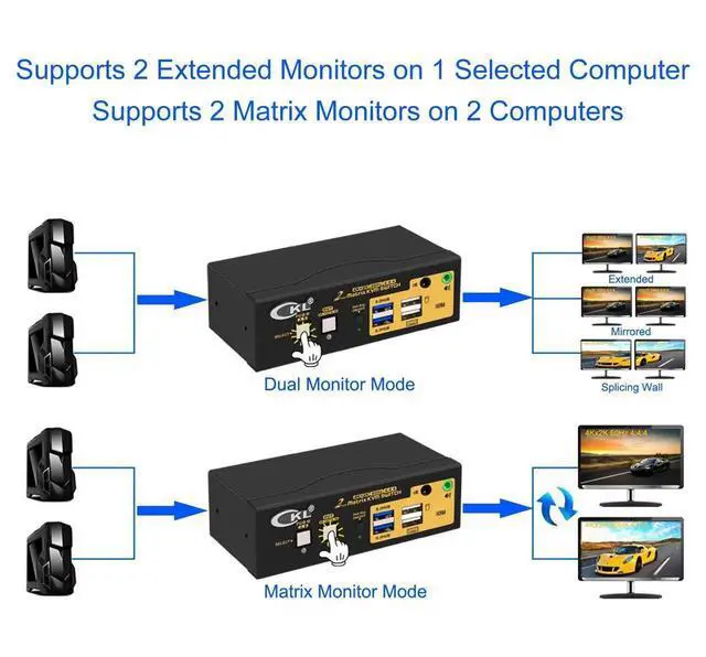 KVM SWITCH FOR 2 MONITORS AND 2 COMPUTERS: Support both dual extended or mirrored displays on 1 selected computer or 2 matrix display on 2 different computers (1 monitor on 1 computer and swap them easily;
