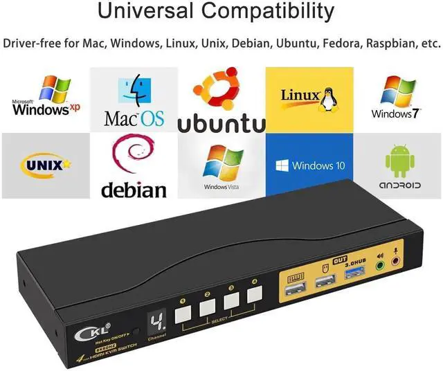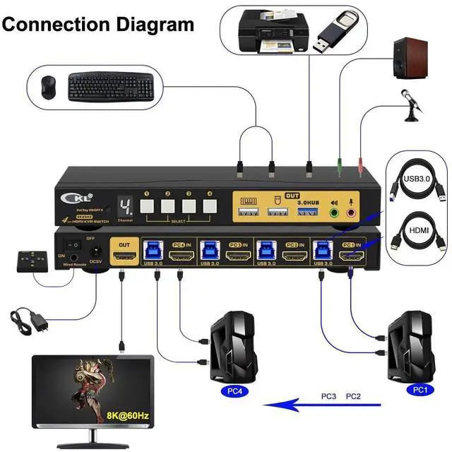 USB 3.0 KVM SWITCH 1 MONITOR 4 COMPUTERS: The integrated USB 3.0 HUB ports allows you to share 1 more USB peripherals like printers, webcam, flash drives and headset between 4 computers. It has 1 HDMI output larger and view on one selected computer and switch between computers within 2-3 seconds.