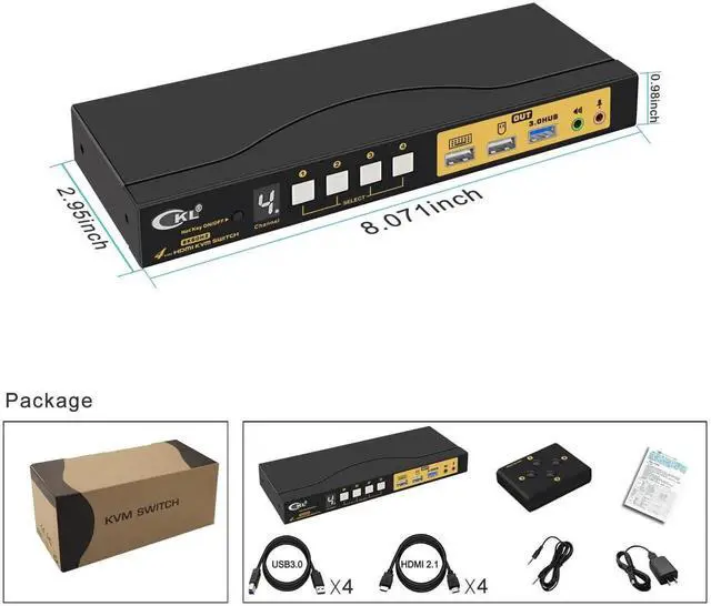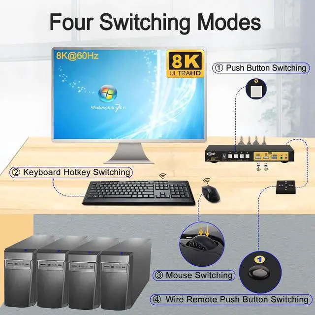 4x1 KVM SWITCH HDMI 8K 60HZ 4K 144HZ : Newest HDMI 2.1 technology to achieve max. Resolution of 7680*4320@30/60Hz, 5120*2880/1440@50/60Hz, 3840*2160@144Hz, 3440*1440@144Hz, 3840*1080@240Hz, 2560*1440@144Hz, ideal for high resolution needs and gaming without delay. Supports EDID emulation to maintain correct display.