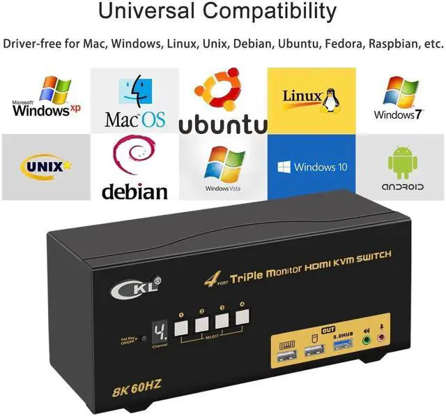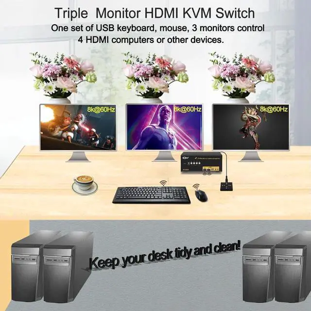 HDMI KVM SWITCH TRIPLE MONITOR 4 PORT: If you have 3 or 4 computers or laptops, one for personal or gaming, the other for work, this is a premium tool for you to control them using 1 set of keyboard, mouse and triple extended monitors, and share 1 more USB peripheral. Save your space and equipment spending significantly.