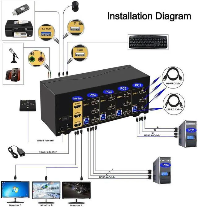 USB 3.0 KVM SWITCH 3 MONITORS 4 COMPUTERS: The integrated USB 3.0 HUB ports allows you to share 1 more USB peripherals like printers, webcam, flash drives or headset between 4 computers. It has 3 HDMI outputs for extended or mirrored displays on one selected computer at the same time.