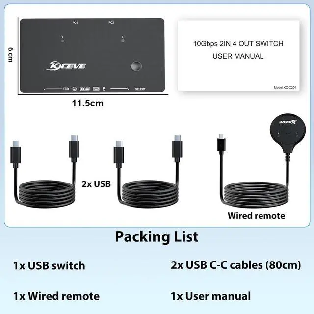 • USB 3.2 switch for 2 USB-C laptops, it is friendly to USB-C computer user. Provided with 2 excellent USB C-C cables (60cm) and 1 wired control. This wired control is big and touch feel comfortable, this is upgraded by KCEVE team.