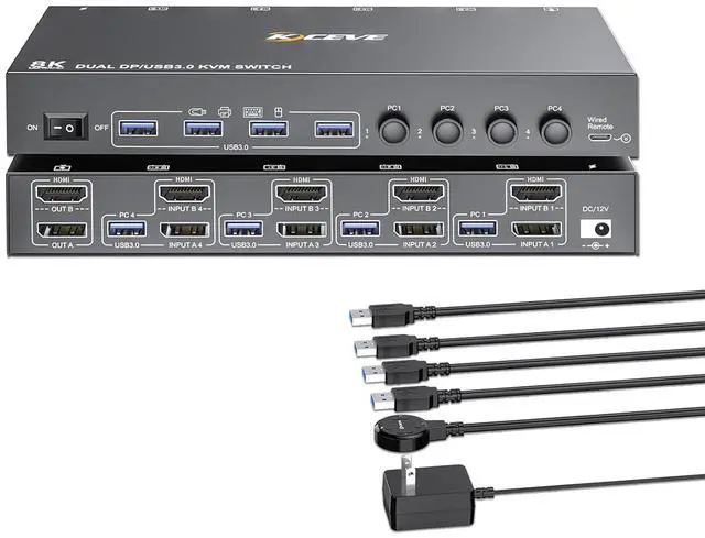 With 4 USB 3.0 USB PortsThis 2 monitors DP HDMI KVM switch with 4 USB 3.0 port for sharing mouse, keyboard, USB printers, scanners, etc,. USB 3.0 transmission is more stable and faster, if you are looking for a USB 3.0 version KVM switch this will be a good choice!
