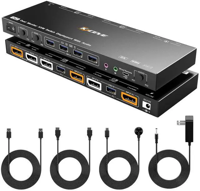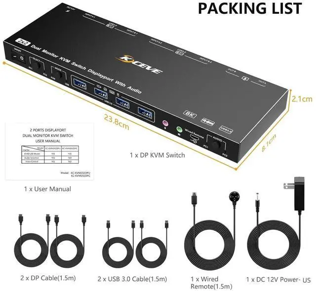 Voice ControlSupport 3 switching modes, physical button, wired control and voice control, the biggest advantage of this DP dual monitor kvm switch is that it supports switching via voice control. It was designed by KCEVE team.