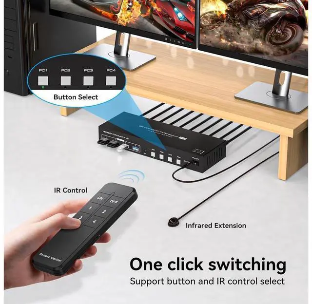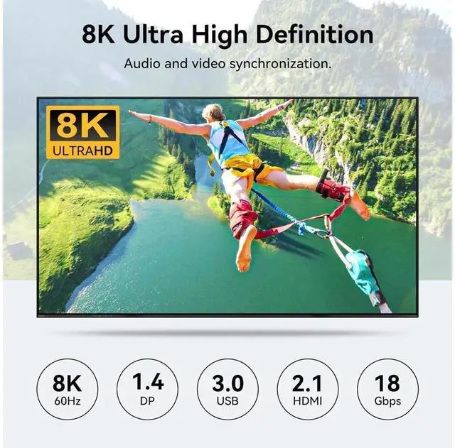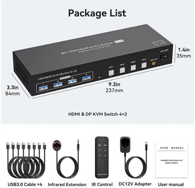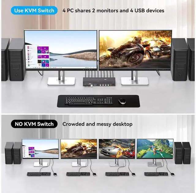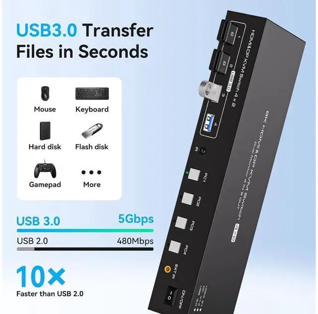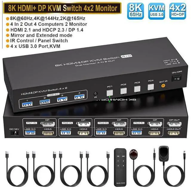 8K 60Hz 4x2 HDMI + Displayport USB 3.0 KVM Switch allows you to share one USB keyboard, USB mouse, and One DP monitor & One HDMI monitor to control 4 computers, laptops, game consoles.
