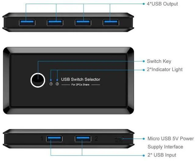 4 Port USB Sharing Switch: This 4 Port USB3.0 Sharing Switch allows one button swapping between 2 computers to share 4 USB 3.0 peripheral devices without constantly swapping cables or set up complicated network sharing software; Ideal for sharing devices such as printer, scanner, mouse, keyboard, card reader, flash drive and other USB deivce between 2 computers;