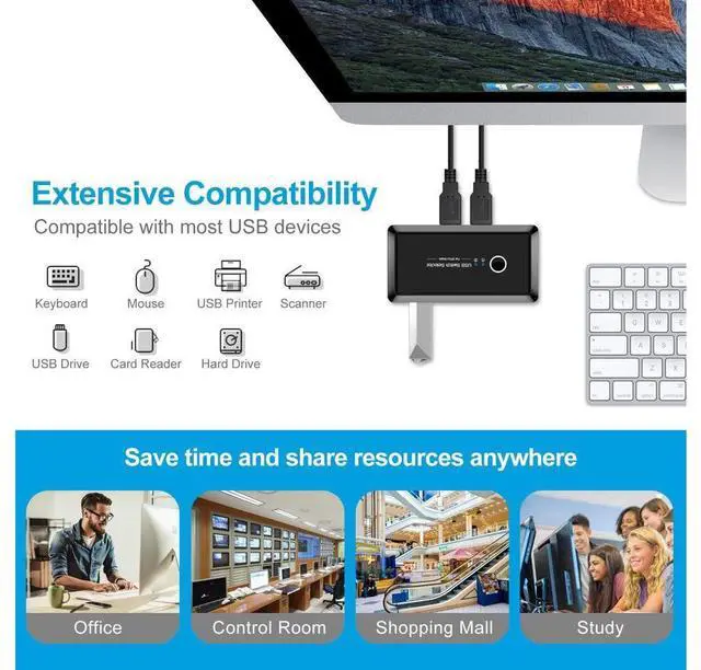 Share 4 USB devices between 2 Computers 4Port USB Switch is an excellent choice to share 4 USB devices between two Comptuers; It's ideal for sharing a printer or scanner in a small office environment; It's also great for use at home if you have multiple PCs or Macs;