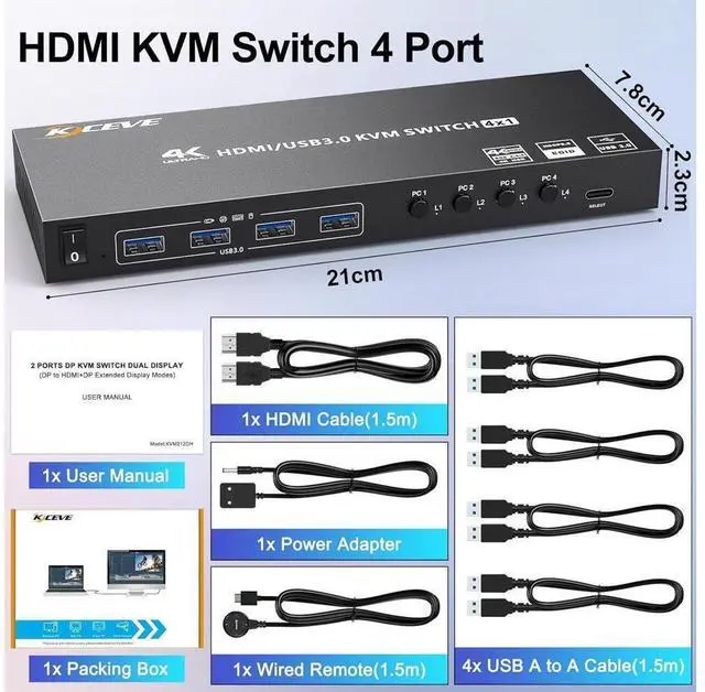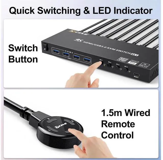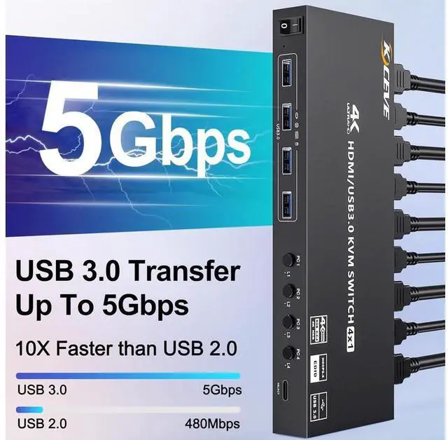 USB 3.0 HDMI KVM switch with 4 USB 3.0 ports (for connecting USB devices) Supports ultra-fast USB 3.0 data transfer, Data transfer speeds up to 5Gbps, and is backward compatible with USB 2.0.