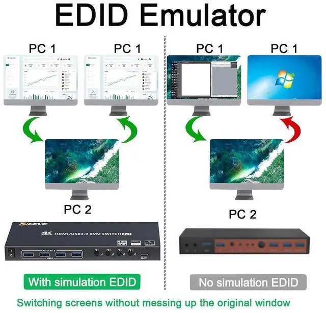 • [EDID Adaptive] The HDMI KVM switch can simulate the EDID of the monitor, store the resolution and refresh rate of the display.