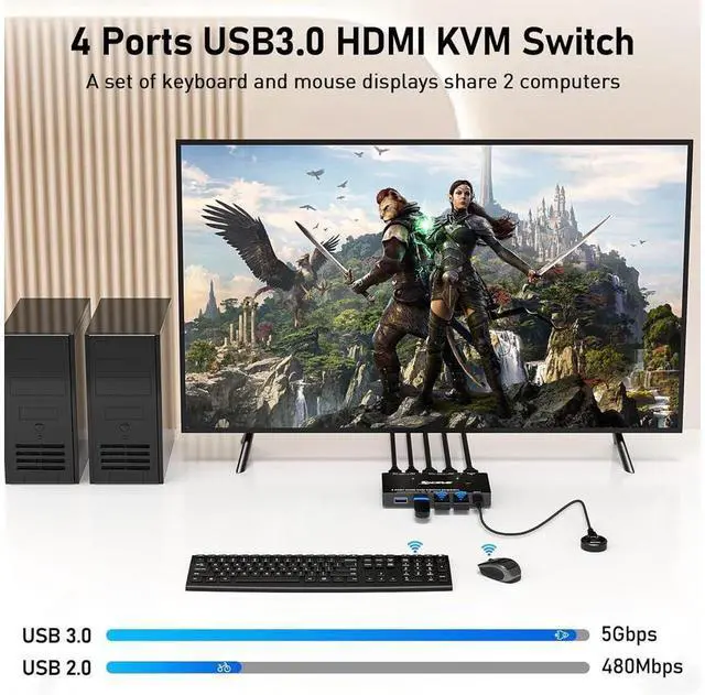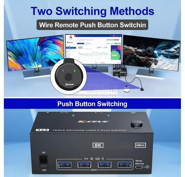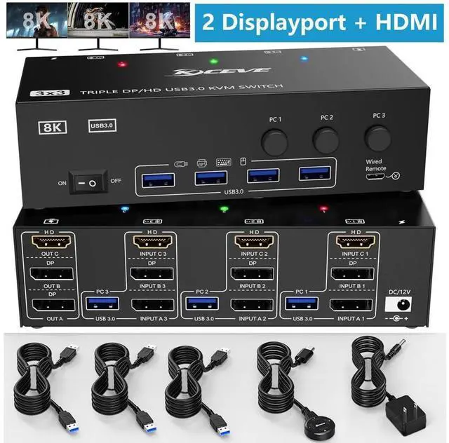 2 Displayport 1.4 +HDMI 2.1 USB 3.0 Triple Monitors KVM Switch allows 3 desktop computers/laptops to share 3 monitors and 4 USB 3.0 ports(keyboard, mouse and other USB devices). It can make your work space tidy and efficient, also a premium choice for working from home.