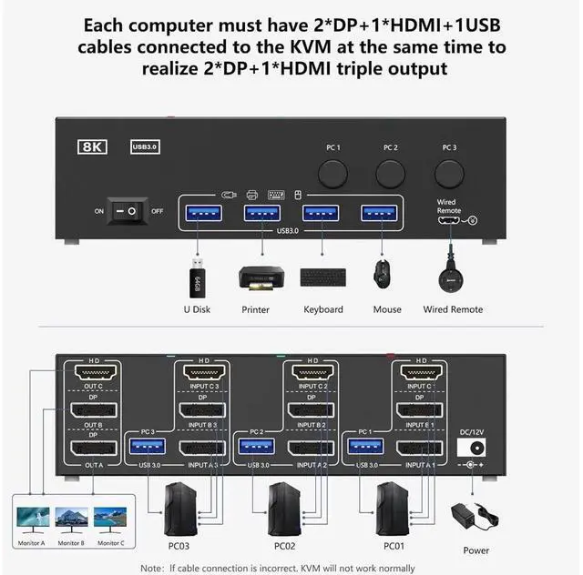 Each computer requires 1*HDMI+2*Displayport +1* USB cable to connect the 3 monitor KVM switch, OUT A, OUT B, OUT C connect to 3 monitors.