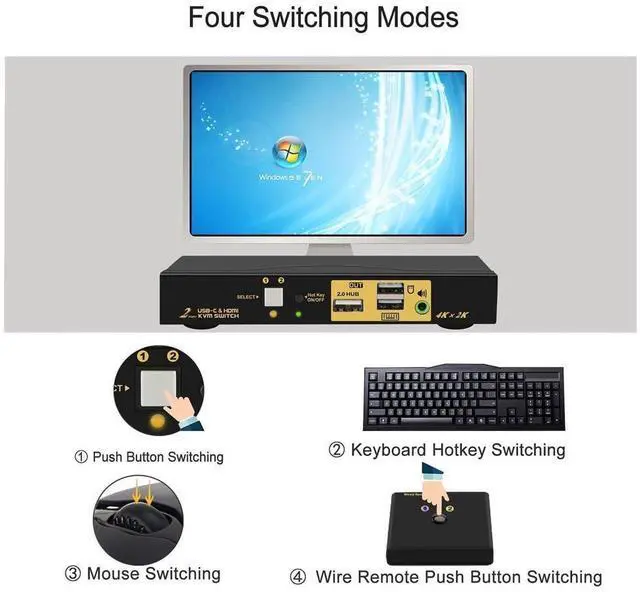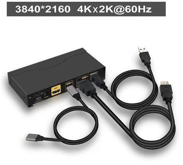 3. USB KVM Switch 2 Computers: Compatible 3840x2160@60Hz and lower resolution. Support wireless/wired keyboard and mouse, Apple keyboard.