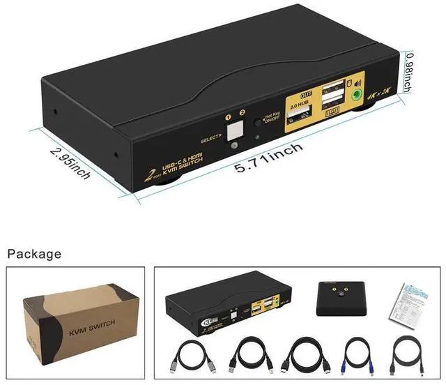 1. KVM Switches: 1 USB-C input & 1 HDMI input, 1 HDMI output. 2 computers / Mac / laptops / mobile phones sharing one set of keyboard, mouse, 1 monitor and 1 USB 2.0 peripheral. With 3.5mm stereo audio output and all input port cables. Compatible thunderbolt 3.