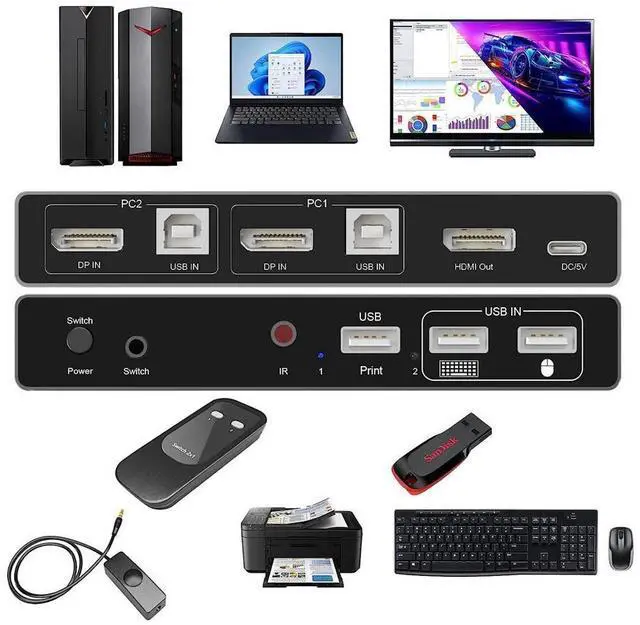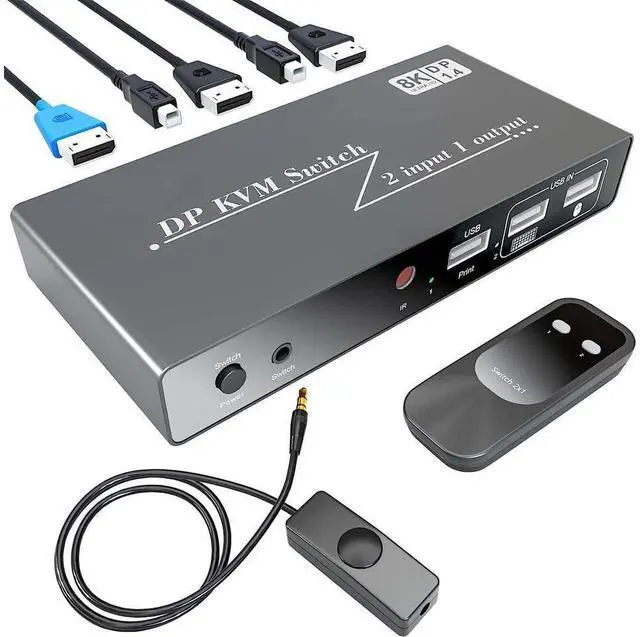 8K DisplayPort KVM Switch -the KVM Switch Displayport helps you share one monitor and 3 USB 2.0 devices, such as scanner,printer, mouse and keyboard, between two PCs. Use 1 set of input device and one 8k@60Hz 4k@144Hz 2k@165Hz monitor for 2 computers.