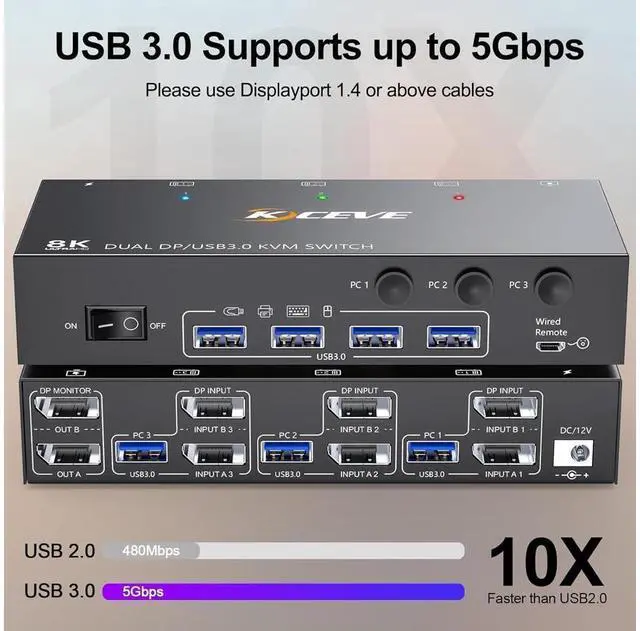 USB 3.0 KVM Switch 3 PC 2 Monitore Displayport 4K@144Hz