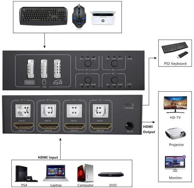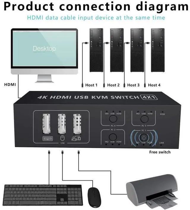 * In order to be compatible with more keyboards, mouce, printers and U disk, this 4 port switch does not support hotkey switching.