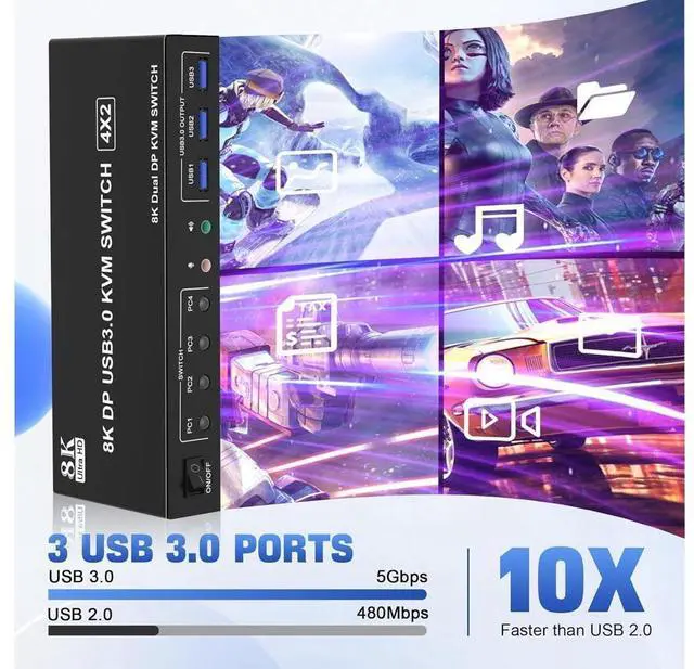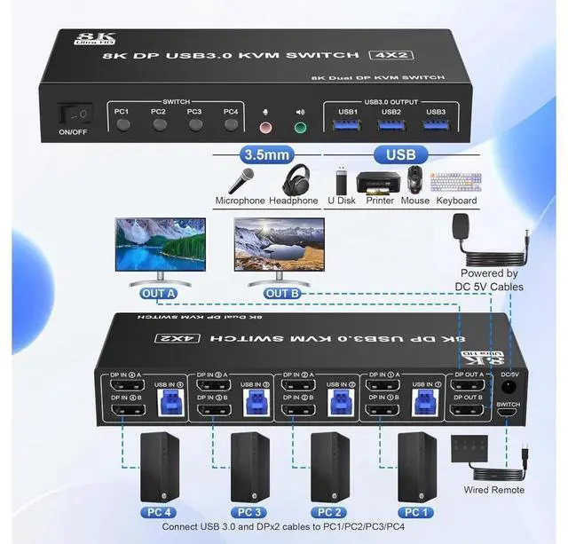 4 Port 8K Displayport USB 3.0 Dual Monitor KVM Switch 8K@60Hz-4 computers share 2 monitors and 3 USB 3.0 devices