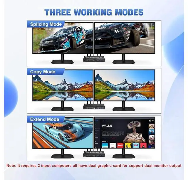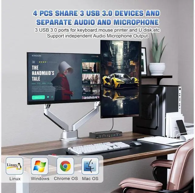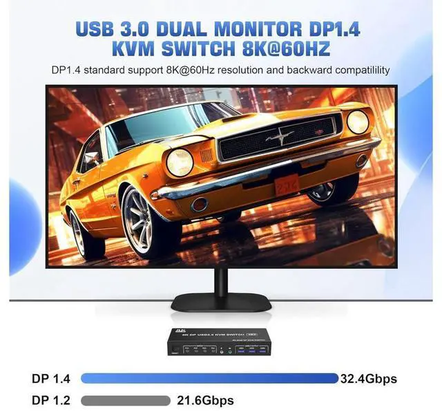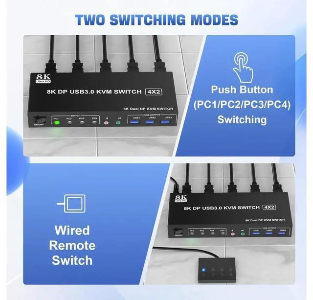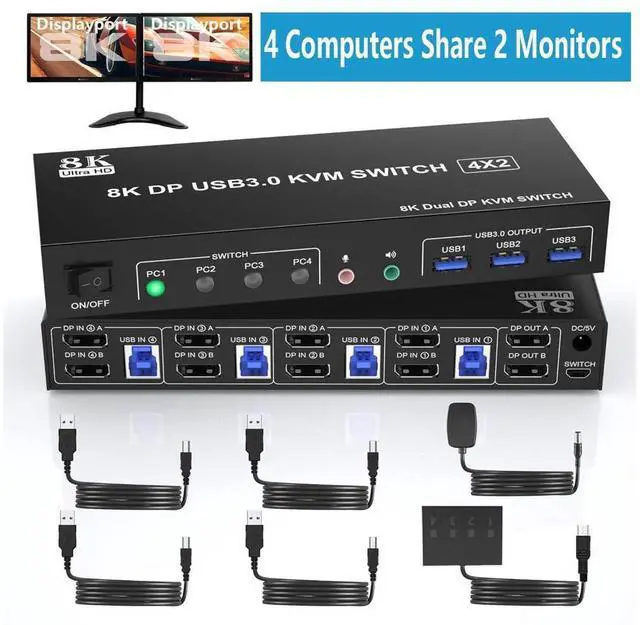 1. 8K DisplayPort KVM Switch 4-Port allows 4 computers/laptops share one set of keyboard, mouse, and 2 monitors (DisplayPort+ DisplayPort)